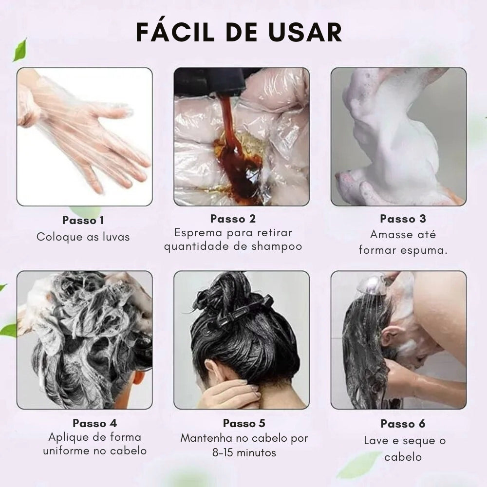 Basta aplicar como um shampoo normal, aguardar alguns minutos e enxaguar. Funciona para cabelo, barba e sobrancelhas, deixando tudo com cor mais uniforme. Sua fórmula suave com ingredientes naturais trata os fios enquanto colore.